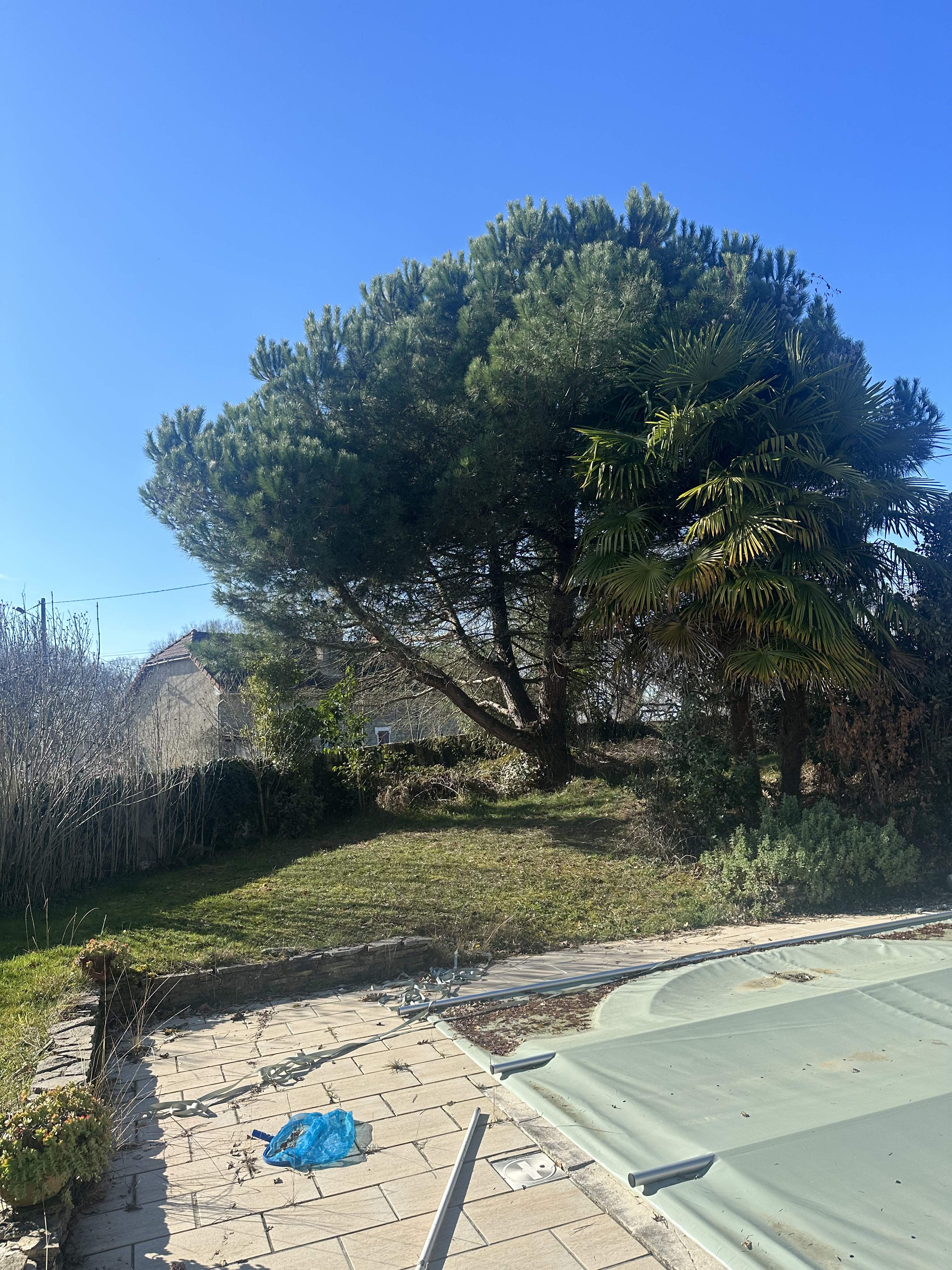 Lors de cette intervention, il a été réalisé l'abattage d'un pin, l' évacuation de déchets verts ainsi que le rognage de souche.